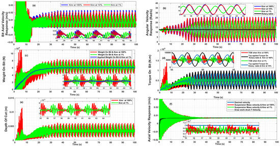 Finally, to further support the MRE-F modeling assumptions discussed earlier, Figure 4m presents the axial displacement responses of the suspension mass, bottom-hole assembly (BHA), and bit at the initial absorber’s coefficients values. This figure clearly shows that the axial responses of the BHA and bit are closely aligned, with only a minor, stable deflection between them during the entire drilling operation.