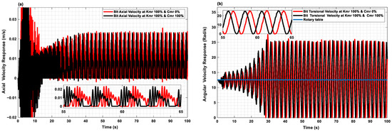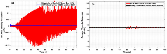 Responses of the drilling system at Vd =7 mm/s, wd = 120 RPM, Kmr 0.001%, and Cmr 100%: (a) Bit and BHA axial velocity responses; (b) Bit and rotary table torsional velocity responses.