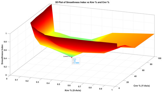 The lowest smoothness index shown at Kmr 0.4% and Cmr 50% when considering both velocities to be of equal importance (i.e., ).