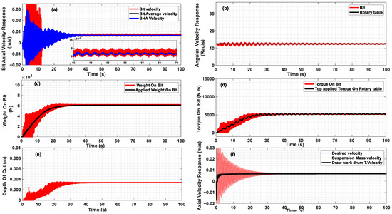Next, the system is gradually lowered from the top using the drill line, which is extended by the drawworks until the PDC bit contacts the bottom formation, the cutting process starts, and the suspension mass attains the required top axial velocity Vd. The increase in axial velocity is managed by the drawworks’ motor and is mathematically expressed by a hyperbolic tangent function in the supplied voltage, VC.