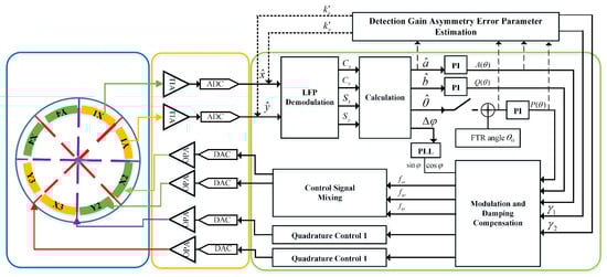 Previous efforts to mitigate detection gain asymmetry error have focused on isolated treatments. Sun et al. [] optimized electrode geometry to improve scale factor linearity. Vatanparvar et al. [] used nonlinear least squares to identify gain mismatches based on angle-dependent bias, requiring high-rate excitation. Fan et al. [] implemented a virtual rotation-based self-calibration method dependent on stable precession, while Xu et al. [] employed time-division multiplexing to enable single-channel control and reduce gain-phase mismatches. Despite their benefits, these methods often neglect coupling interactions or require additional excitation mechanisms.
