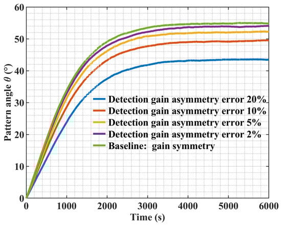 Simulated drift of the pattern angle  under different detection gain asymmetry levels (0–20%) with a fixed 10% damping asymmetry and zero angular velocity input.