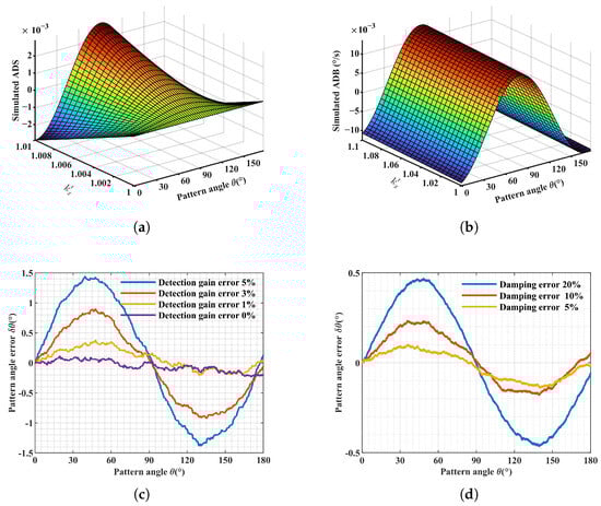 (a) Simulated ADS under different detection gain asymmetry errors. (b) Simulated ADB under different detection gain asymmetry errors. (c) Experimental pattern angle error under different detection gain asymmetry errors. (d) Experimental pattern angle error under different damping asymmetry errors.