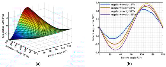 (a) Simulation result of ADB under different angular rates. (b) Experimental pattern angle error under different detection gain asymmetry errors.