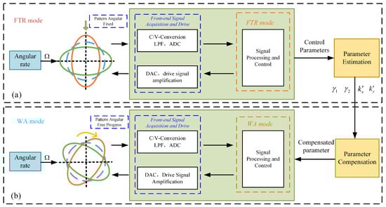 The proposed procedure of the identification and compensation method of detection gain asymmetry error is illustrated in Figure 6. The output data in FTR mode are used to identify the detection gain asymmetry error and damping asymmetry error. The FTR mode control strategy is realized by the traditional method, and the identification process does not affect the normal operation of HRG as shown in Figure 6a. It is important to note that the error parameters identified in the FTR mode—such as the detection gain ratio  and damping asymmetry coefficients —reflect intrinsic structural and interface characteristics of the HRG system. Since the FTR mode and WA mode share the same underlying dynamic equations, with the only difference being whether the pattern angle  is fixed via the angle control force , the identified parameters remain valid when transferred across modes. This cross-mode applicability is further supported by the experimental results, where applying FTR-identified parameters in WA mode significantly reduces bias instability and pattern angle deviation under dynamic conditions. These results confirm that the parameters identified under the stable, non-precessing condition of the FTR mode can be reliably used for error compensation in WA-mode operation. Finally, in the WA mode, the identified detection gain asymmetry error is compensated in the two demodulation channels, and the damping asymmetry error in the control loop is also compensated as shown in Figure 6b.