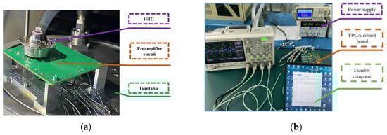 As shown in Figure 7a, the hemispherical resonator gyroscope (HRG) was mounted on the turntable inside a vacuum chamber. Although the chamber was not equipped with active temperature control, the ambient laboratory temperature was maintained within ±1 °C throughout the experiments, which helped suppress temperature-induced variations to a certain extent. The entire setup was installed on a standard passive vibration-isolation platform to reduce the influence of external mechanical disturbances. Figure 7b shows the control circuit and monitor computer system of the HRG. The signal acquisition circuit of the HRG is composed of a TIA and a differential amplifier circuit. The HRG control circuit system is implemented on the ZYNQ platform where the field programmable gate array (FPGA) performs digital multiplier and low-pass filtering on the vibration signal of HRG and then extracts the low-frequency slow-varying information containing the amount of vibration state to the advanced RISC machine (ARM) processor. The corresponding demodulation reference signal can be obtained through the PLL. The slow-varying information was combined in the ARM processor to obtain the corresponding control variable.