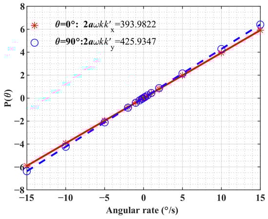 In the identification process of the experimental validation, the HRG operated in FTR mode with pattern angles of 0° and 90°, respectively. Due to the limited dynamic range of the HRG in FTR mode, the detecting gain asymmetry error was calibrated within the rate range of ±15°/s. The HRG worked for 10 min each time and the output of the controller was collected and stored using the monitor computer. The output of the controller is the digitized result without actual units. The average value was calculated as the measurement result. The identified results are shown in Figure 8 as detection gain asymmetry error are  and .