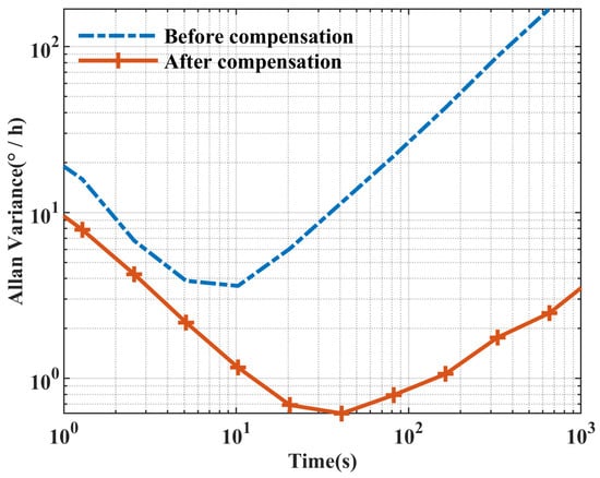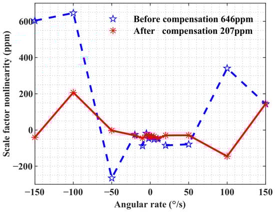 After the compensation of the detection gain asymmetry error and damping asymmetry error, as shown in Figure 9, the Allan variance showed that the bias instability of HRG decreases from 3.6°/h to 0.6°/h after compensation. Compensated HRGs were tested at ±0.1°/s, ±0.2°/s, ±0.5°/s, ±1°/s, ±2°/s, ±5°/s, ±10°/s, ±20°/s, ±50°/s, ±100°/s, and ±150°/s and output rates were linearly fitted to calculate the nonlinearity of the scale factor as shown in Figure 10. The scale factor nonlinearity is reduced from 646.57 ppm to 207.43 ppm after compensation. As shown in Figure 11, the output performance of the HRG is compared under the dynamic angular velocity input of 50°/s. The result shows that the maximum pattern angle error of the compensated gyro is reduced from 0.6° to 0.05°, which is reduced by 91.6%.