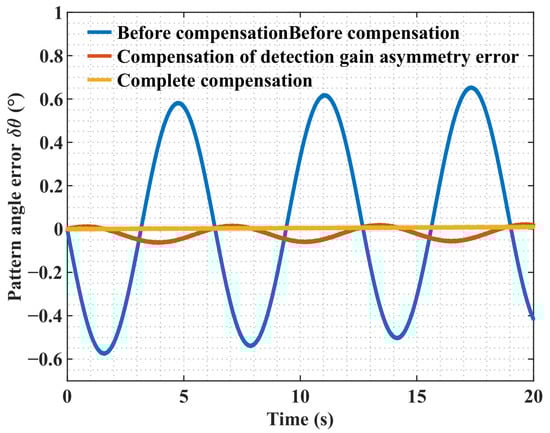 Pattern angle estimation error for detection gain asymmetry error with damping asymmetry error and after compensation.