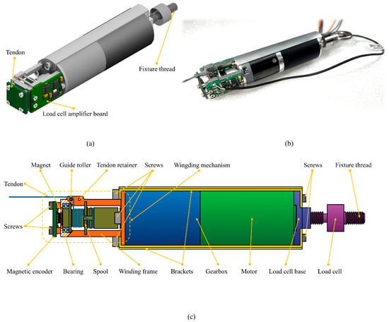 Tendon-driven actuators are the key components of tendon-driven robots [,,], and modular designs have become increasingly popular in recent years due to their ease of assembly and maintenance. To achieve precise tension control, modular tendon-driven actuators are designed to possess proprioceptive capabilities, which allow them to sense a tendon’s tension and length [,].