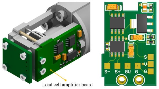 As a proprioceptive actuator, the proposed actuator is equipped with capabilities for tendon length feedback and tendon tension feedback. The tendon tension feedback function is realized through a miniature load cell, which features a diameter of 13 mm, a length of 11 mm, and a weight of 100 g. This load cell operates on the principle of strain measurements and has a bridge-type output structure. The signal amplification circuit of the load cell is directly mounted onto the winding frame, utilizing an instrumentation amplifier as the amplification chip. The PCB (printed circuit board) of the amplifier is shown in Figure 3.