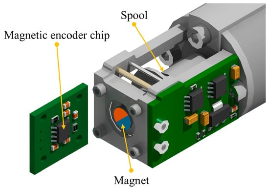 The variation in the length of the tendon cannot be directly measured through sensors and instead can only be estimated through the angular position sensor of the spool and observation algorithms. To minimize the size of the actuator, the proposed design employs a 3D Hall effect sensor to measure the angular changes in the spool. The 3D Hall effect sensor requires a permanent magnet to operate, and the sensor itself has a thickness of only 1.72 mm, which is smaller than the thinnest potentiometer. A permanent magnet can be embedded within the spool, thereby ensuring that it does not compromise the overall size of the sensor. This sensor’s measurement range is limited to 0–360 degrees, equivalent to a single-turn absolute encoder. During actuator operation, the spool will rotate multiple times, and its effective radius will also change gradually with the tendon’s winding, thereby necessitating the use of observation algorithms to estimate the tendon length. The 3D Hall effect sensor and its relative position with the magnet are shown in Figure 4.