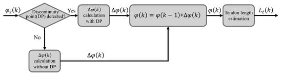 The spool angle sensor is limited to detecting angles within a single revolution (0 to 360 degrees), making it equivalent to a single-turn encoder. However, during actuator operation, the spool may undergo multiple revolutions. Furthermore, measuring the spool angle does not provide a direct measurement of changes in the tendon length. To address this limitation, a tendon length observer is designed to estimate tendon length changes based on the spool angle measurements, enabling accurate monitoring of variations in the tendon length. The working principle of the observer can be illustrated in Figure 5.