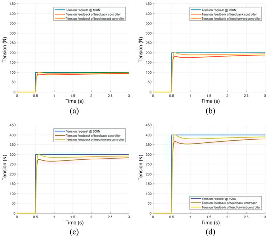 The actuator tension response to the step input with feedforward and feedback control: (a) the tension response when the tension setpoint is 100 N; (b) the tension response when the tension setpoint is 200 N; (c) the tension response when the tension setpoint is 300 N; and (d) the tension response when the tension setpoint is 400 N.
