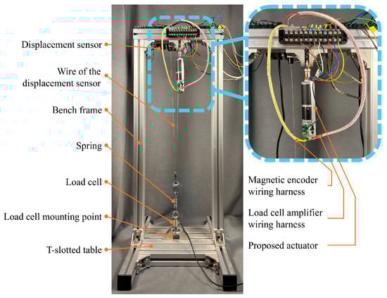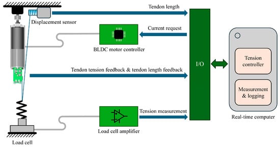 To validate the performance of the actuator, a testbench was set up, as shown in Figure 8, and its architecture is shown in Figure 9. The testbench consists of a draw-wire displacement sensor to measure the changes in the tendon length and a load cell to measure the tendon tension. These sensors are not utilized as input for the actuator’s tension control but rather serve as a means to evaluate the effectiveness of the actuator’s tension control. The control circuit includes a motor driver to drive the actuator motor, a power supply, and a real-time target machine to run the control algorithm and collect data.