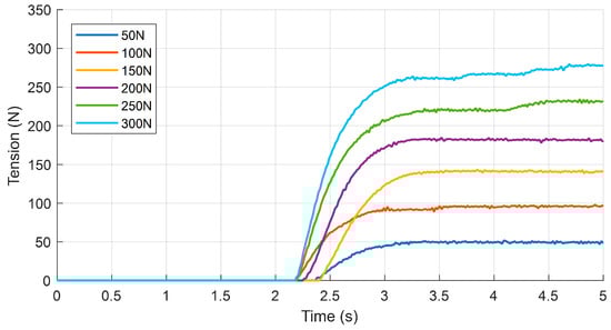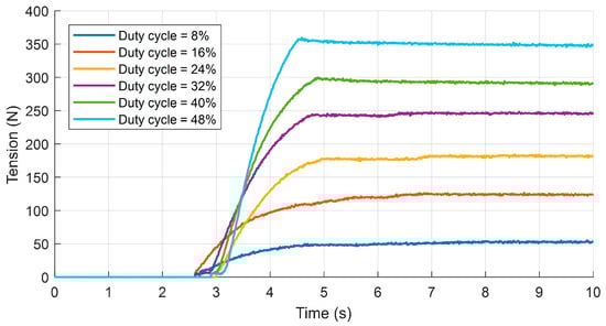To validate the effectiveness of the closed-loop tension control strategy and compare the performance of the feedback tension controller and the feedforward tension controller, a series of tension step response tests were conducted. First, the authors performed open-loop tension response tests to establish a baseline to compare with the closed-loop control’s performance. During the open-loop testing, the actuator was driven using different duty cycle signals, with the duty cycle ranging from 8% to 48% in increments of 8%. Prior to each test, the tendon was manually adjusted to a non-slack state. In each test, the step time of the step signal was 2.5 s. The results of the open-loop testing are shown in Figure 10.