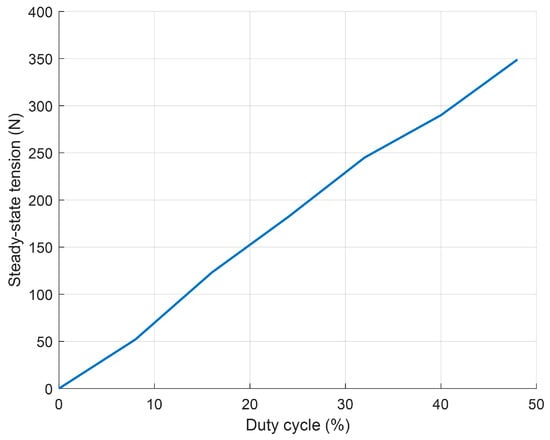 In addition to the rate of the increase in tension, the steady-state tension also increases with the growth of the duty cycle. Figure 11 illustrates the relationship between the steady-state tension and the duty cycle of the drive signal, revealing a clear proportional relationship between the two. This relationship serves as the basis for determining the feedforward coefficient.