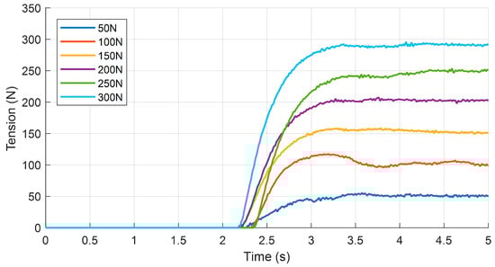 Under low duty cycles, the open-loop control strategy exhibits a slow tension response, which can be effectively improved using the closed-loop tension controller. In this test, the actuator was tested under a series of tension step inputs. The tension requests will range from 50 N to 300 N, with an interval of 50 N. The step time for each tension request is 2 s. Figure 12 illustrates the actuator’s tension response under PID control.