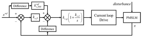 For positioning servo systems, the cascade P-PI controller shown in Figure 1 and its supplement [] have been widely studied and applied due to their simple structure, easy tuning, and high robustness. However, in high-dynamic applications, the integral controller increases the time constant of the internal control loop, which deteriorates the system’s dynamic performance. Consequently, extensive research has focused on developing new control methods to enhance servo performance. Sliding mode control (SMC) has been applied in linear motors due to its excellent dynamic performance [,,]. It achieves good tracking performance, but the chattering phenomenon inherent in SMC is inevitable. In addition, robust bounded control [] and reinforcement learning [] have been investigated and implemented. However, the structural complexity of these methods remains a primary limitation for practical applications.