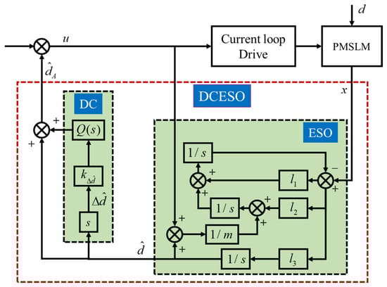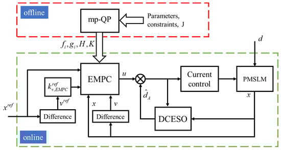 To address the high computational cost of MPC and the trade-off between stability and disturbance estimation dynamics, this paper proposes a 2-DOF control scheme. The scheme integrates explicit model predictive control (EMPC) and an extended state observer with a differential compensator (DCESO) for PMSLM-based positioning servo systems. The control structure is shown in Figure 2.
