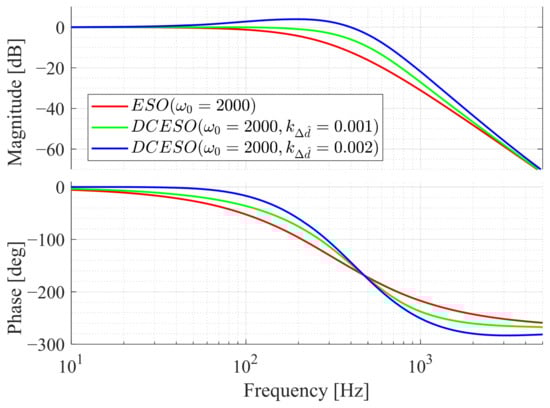 The effectiveness of the modification can be verified in the simulation, with the results shown in Figure 4. When , , and , increasing effectively enhances the bandwidth of the estimation process. However, excessive increases the magnitude–frequency response, causing oscillation in the estimation. Therefore, in DCESO must be set appropriately. In addition, and should also be configured according to environmental noise and equipment characteristics.