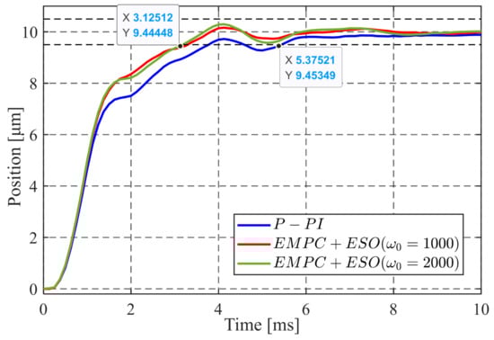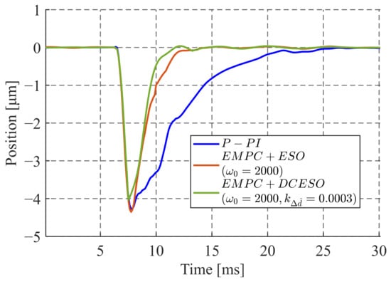 To verify the disturbance rejection, a disturbance current of 2.5 A was applied while the reference position was maintained at 0. The results are shown in Figure 9. For the P-PI controller, the servo lag is about 4.29 μm, and the settling time is about 15.13 ms. In contrast, in the EMPC + ESO control scheme, as the pole increases to 2000 rad/s, the servo lag decreases to 4.35 μm, and the settling time decreases to 5.87 ms, representing a 61.2% improvement.