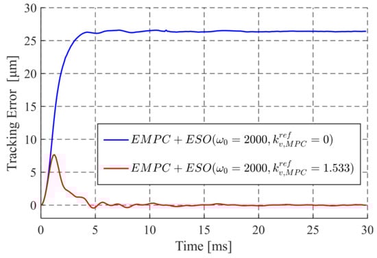 To further eliminate the tracking error at a constant speed, the feedforward control parameter of EMPC is tuned, and the results are presented in Figure 8. The experiment was conducted using a ramp reference with a speed of 20 mm/s. Without feedforward, the tracking error of the EMPC + DCESO remains at about 26 μm, and the settling time is about 5 ms. By gradually increasing the feedforward coefficient, the steady-state tracking error can be reduced to near 0 μm. This significantly improves tracking performance.