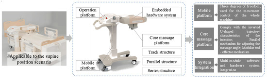 Figure 1 shows the overall design scheme of the series-parallel abdominal massage robot mechanical system. This conceptual device consists of four main parts: (1) The three-degree-of-freedom (up-down, left-right, front-back) mobile platform of the robot, which is used for the movement of the whole machine. (2) The core massage platform, which includes the following: (a) a track structure, used to achieve the movement characteristics of the massage trajectory along the inverted U-shaped trajectory of the intestine; (b) a parallel structure, used to achieve stable operation of pressing and pushing techniques, adjustment of the massage angle, and fine-tuning of the massage trajectory; and (c) a series structure, with a universal design, to which different forms of end massage execution mechanisms can be added to adapt to different usage scenarios. (3) The control hardware system, composed of multiple motors, sensors, and their supporting drive boards and circuit boards, etc., is used for the interaction between the human abdomen and the robot. (4) The whole machine operation platform, including the basic button control of the three-degree-of-freedom mobile platform and the placement platform for the upper computer (such as a mobile phone or a tablet).