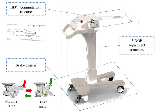 Based on the requirements of the rapid postural adaptation mechanism and positioning ability, this study designed a three-degree-of-freedom mobile platform (shown in Figure 2), which includes a reversing structure, three-degree-of-freedom adjustment, and a braking chassis. Based on the requirements of the supine clinical scenario, this mobile platform adopts a C-shaped topological structure, that is, a cantilever beam is designed at the top of the vertical main structure, and the base extends in the same direction at the bottom to form a stable torque balance system. The top reversing structure consists of a cantilever beam and a damping limit mechanism to achieve reversing. The damping limit mechanism uses a disk damper in combination with a spring-preloaded indexing pin to achieve 180° reversing positioning. The vertical main body is composed of a Z-axis vertical lifting unit (lifting column) and X/Y axial translation units (two linear stepping motors) to form a three-degree-of-freedom adjustment module, which can achieve the adjustment function of aligning with the navel and a maximum three-degree-of-freedom adjustment space of 100 mm × 100 mm × 100 mm. The base is a braking system with double universal double Fuma wheels. When in use, it needs to be extended under the bed body and is consistent with the trend of the top reversing mechanism to form a stable torque balance system. The movement adopts an omnidirectional movement scheme. The front wheel set is designed without a locking mechanism, and the rear wheel set integrates a foot-operated braking Fuma wheel. The traditional tangential locking method is replaced by friction braking on the contact surface, effectively overcoming the stability defects of the traditional universal wheel combination when not all wheels can be braked.