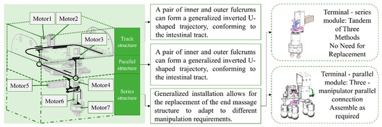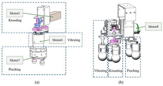 Multi-scheme design of the series-connected massage end-module: The lower-layer series-connected massage end-module is designed with a universal interface, which is used to combine massage ends as needed according to different application requirements, to achieve three required manipulation techniques: vibration, kneading, and pinching. In order to distinguish different application requirements, two schemes are designed: the three-manipulation series-connected structure (Figure 4a) and the three-manipulation parallel-on-demand structure (Figure 4b). The published research [27] introduced the three-manipulation series-connected structure, which is characterized by functional continuity. It does not require combined installation and is suitable for scenarios where all three manipulation techniques need to be applied, and long-term stable operation is required. The overall height is relatively large, making it suitable for people who do not mind a long massage end. The three-manipulation parallel-on-demand structure, on the other hand, has the core advantages of dynamic collaboration and flexible reconfiguration, with a higher degree of integration. It is suitable for people who need parallel kneading and pinching techniques and those who mind the excessive length of the massage end. However, the parallel-connected massage execution ends require manual quick-disassembly and quick-assembly intervention. The differences between the two in topological configuration, functional expandability, and space efficiency provide complementary solutions for different clinical application scenarios.