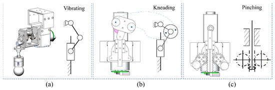 The schematic diagrams and kinematic diagrams of the three techniques in the on-demand parallel structure scheme of the three-technique method are shown in Figure 5. Analyze the motion characteristics of the vibrating technique from the side view (Figure 5a), and analyze the motion characteristics of the kneading technique and the pinching technique from the bottom view (Figure 5b,c).