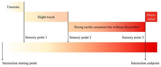 This study is based on the pressing method with a relatively low operating frequency and uses the manipulation of a single degree of freedom to study the interactive control strategy of massage force. In the second study on the biomechanical properties of the abdomen [28] conducted by our team during the same period, the collection of force–displacement coupling data of the massage interaction force of the pressing method was completed. This study will establish a safety control algorithm based on safety thresholds. In the actual interaction process, the subjective feelings of the subjects range from no feeling to discomfort and inability to continue, as shown in Figure 7. The turning point from no feeling to a slight feeling is recorded as sensory point 1; the turning point from a slight feeling to a strong feeling without discomfort is recorded as sensory point 2; and the turning point from a strong feeling without discomfort to a strong feeling with discomfort is recorded as sensory point 3. Analyzing these three points provides a basis for dividing the light, medium, and heavy massage forces.
