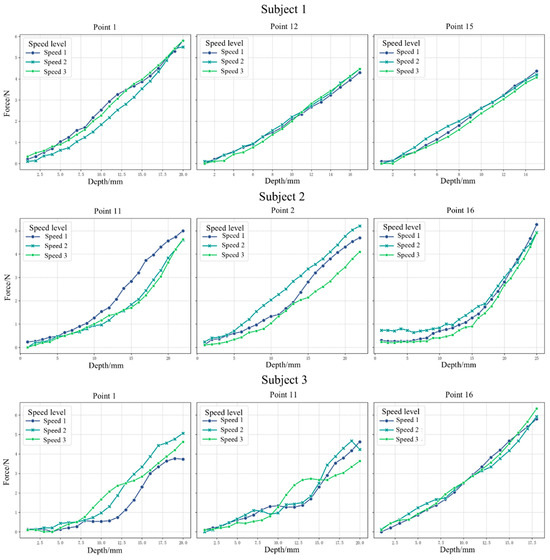 Average massage force and pressing depth curves at three sensory points of three subjects under different speeds.