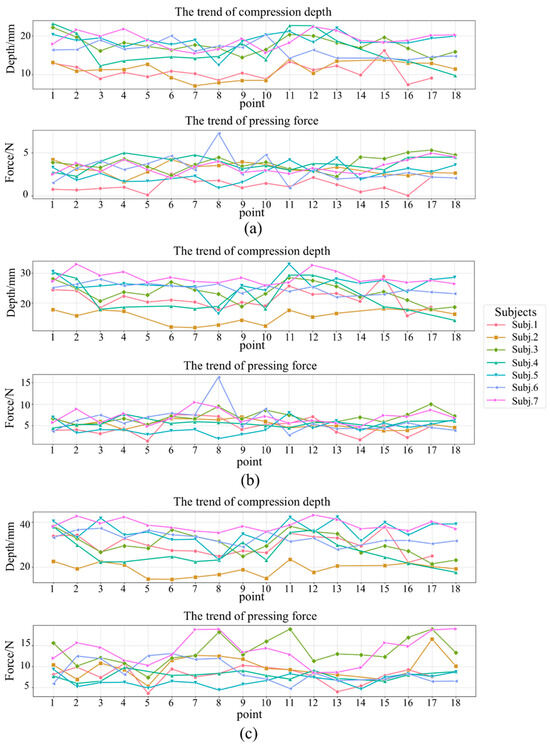 Report the significance levels of each factor through the ANOVA table (Table 4). According to the results in the table, individual differences are significant at sensory points 1 and 3, but not significant at sensory point 2, which may be caused by the physiological or perceptual differences in the subjects. Therefore, in clinical massage applications, it is necessary to prioritize personalized adjustment of the intensity rather than relying on a unified standard. Therefore, the distinction of light, medium, and heavy intensities in abdominal massage should vary from person to person. Trend diagram of pressing depth and force corresponding to sensory point 1 is shown in Figure 10.