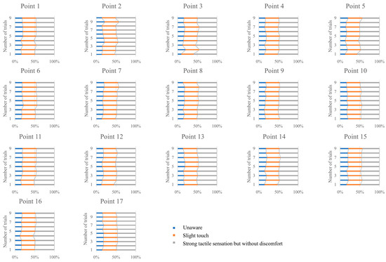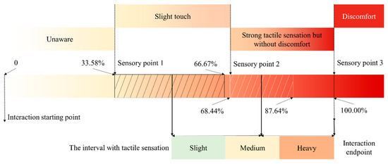 Summarize the three-sense distribution of all valid points of seven subjects (as shown in Figure 12), and calculate the range within the 95% confidence interval. It can be seen that the distribution range of sensory point 1 is 33.58–66.67%, and the distribution range of sensory point 2 is 68.44–87.64%. Based on the above data, this study sets the light, medium, and heavy ranges of the pressing force within the distribution ranges of the two sensory points. The insensitive interval and the discomfort interval during the interaction process are removed, and the remaining two sensory intervals are divided into three equal parts. The front section, middle section, and end section are defined as light, medium, and heavy pressing forces, respectively, as shown in Figure 13.