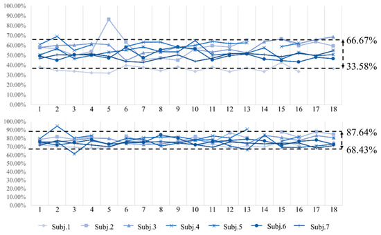 This paper shifts the research focus to the distribution patterns of the subjects’ three sensory points throughout the entire experimental process and aggregates the results from seven subjects. This enables us to study the proportional relationship of the three sensory points throughout the interaction process. In this study, sensory point 3 is set as the end point of the interaction, that is, it is located at the 100% position in the entire interaction process. The proportional relationship of the remaining sensory points 1 and 2, after data processing, is shown in Figure 11.