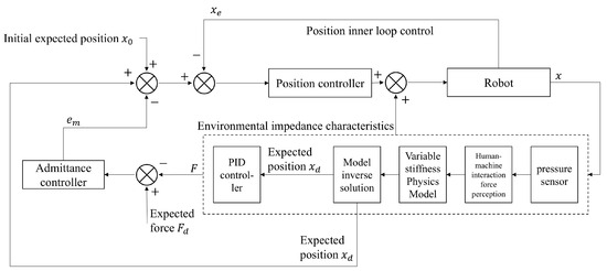 Select this variable-stiffness physical model to represent the force–displacement mapping relationship. During the actual massage process, the prediction results of the variable-stiffness physical model are added as feedforward input to improve the high-precision tracking control of the push rod motor, thus achieving stable control of the massage force. An inner–outer loop, admittance-PID hybrid control model is designed. The outer loop employs admittance control to retain compliant interaction characteristics, while the inner loop uses PID control to achieve high-precision tracking, enhancing both tracking accuracy and dynamic response. This combination effectively balances both “safety” and “precision”. Biomechanical adaptation interactive force control strategy incorporating a variable-stiffness physical model is shown in Figure 14.