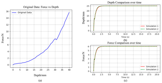 (a) Initial force-displacement data of biomechanical adaptation control integrating a variable-stiffness physical model. (b) Pressing depth result curves of two simulated interactions. (c) Force result curves of two simulated interactions.