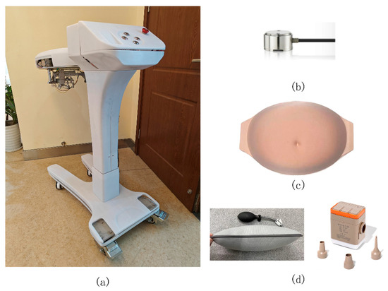 Test platform for abdominal massage robot: (a) Experimental prototype. (b) The miniature tension–compression sensor SBT674. (c) Static simulation prosthesis. (d) Dynamic simulation prosthesis (airbag + integrated portable air pump for inflation and deflation).