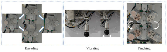 Schematic diagrams of the motions of three massage techniques, namely kneading, pinching, and vibrating, in the parallel structure of the technique in the six-degree-of-freedom core massage platform. Among them, kneading has a cyclic switching of four positional states, and vibrating and pinching have a cyclic switching of two positional states.