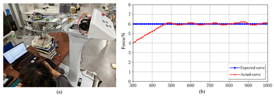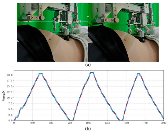 To verify the output force stability of the robot, this experiment adopts an admittance control-based force–position hybrid control strategy to conduct mechanical tests on a static simulated prosthesis. The test scenario is shown in Figure 20a. The actual collected mechanical curve is highly consistent with the expected curve in trend (as shown in Figure 20b), and the error can be stably controlled within 0.2 N. This result indicates that the force–position hybrid control strategy based on admittance control is effective. The robot can accurately track the expected force curve during the massage process, achieving precise control of the magnitude and change the trend of the massage force, ensuring the stability and accuracy of the massage intensity and laying a solid foundation for providing stable and effective massage services to patients in practical applications.