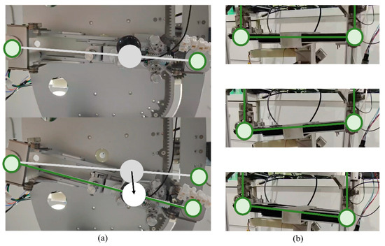 (a) Schematic diagram of the pushing motion in the performance test of the massage mode; (b) schematic diagram of the end angle adjustment motion of the massage. The gray circles represent the starting positions of the pushing method, the white circle represents the ending positions of the pushing method, and the black arrow represents the directions of the pushing method. The pushing method cycles between the two different positional states.