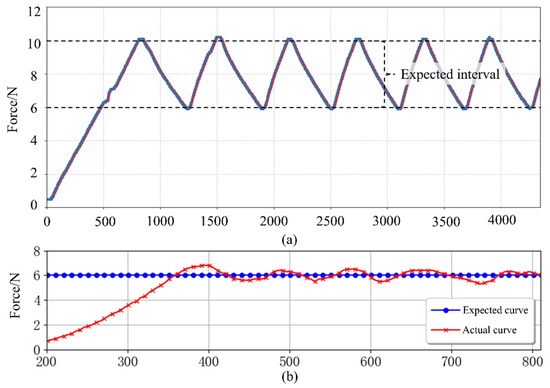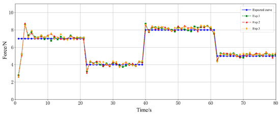 It can be seen from Figure 24 that within the range of 3.0–4.0 N, the overshoot of dynamic force tracking is 0.2 N; within the range of 3.0–6.0 N, the overshoot of dynamic force tracking is 0.5 N; within the range of 3.0–8.0 N, the overshoot of dynamic force tracking is 0.7 N.