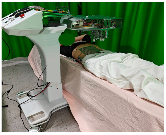 The test platform for the abdominal massage robot mainly consists of a prototype of the abdominal massage robot for testing, a static simulation prosthesis for testing, a dynamic simulation prosthesis for testing (airbag + integrated portable air pump for inflation and deflation), a bed body, and distributed pressure sensors, as shown in Figure 16.