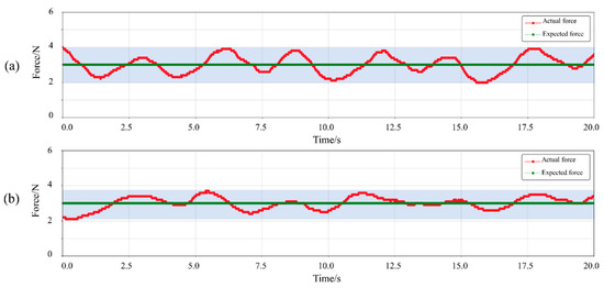 Comparison of the time-domain characteristics of force under constant force tracking of two strategies: (a) fuzzy adaptive admittance control strategy [27]; (b) biomechanical adaptation control strategy integrating variable-stiffness physical model. The blue shadow represents the fluctuation range of the interaction force.