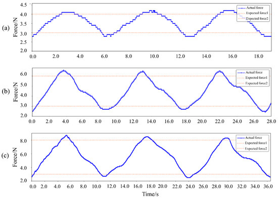 (a) Dynamic force tracking results for the expected pressure value range of 3.0–4.0 N; (b) 3.0–6.0 N; (c) 3.0–8.0 N.