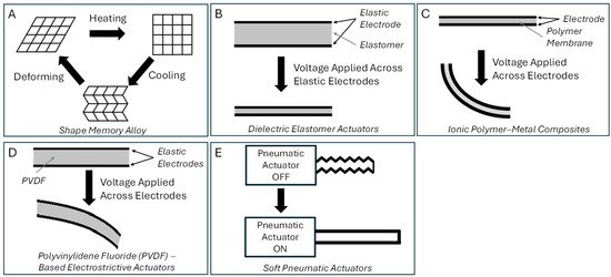 Soft robotics, a domain closely aligned with bio-inspiration, has demonstrated the value of compliant actuators in systems requiring high degrees of adaptability and physical interaction. These actuators rely on unconventional mechanisms like thermomechanical phase transitions (shape memory alloys), electrostatic deformation (dielectric elastomers), ion-driven bending (ionic polymer–metal composites), electrostrictive mechanisms (polyvinylidene fluoride (PVDF)-based electrostrictive actuators), and pressurized expansion (soft pneumatic actuators) to generate movement [2,3]. Their ability to undergo large strains while maintaining structural integrity makes them especially suited for automotive applications where a variable geometry, passive compliance, and multifunctional integration are critical, particularly in reconfigurable interiors, active suspensions, morphing aerodynamic surfaces, and soft human–machine interfaces. Figure 1 shows a schematic of each of these five categories of bio-inspired actuators.