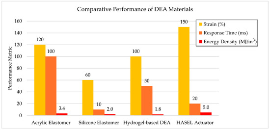 Comparative performance metrics of various DEA materials used in soft actuator systems. HASEL actuators exhibited the highest strain and energy density, while silicone elastomers offered a rapid response. The data were adapted from [15,16,18,19,20].