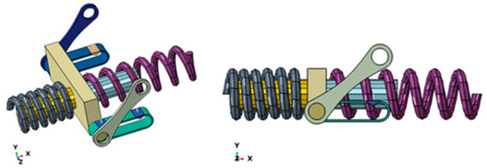 Sellitto et al. [34] demonstrated a numerically simulated SMA-based active suspension system for off-road vehicles, employing thermally activated NiTi elements integrated into a suspension linkage. The system allowed for the real-time tuning of the suspension stiffness and damping by adjusting the SMA state through Joule heating. The simulation results indicated a reduction in vertical displacement and improved vibration attenuation, supporting SMAs’ suitability for terrain-adaptive suspension designs. Figure 3 illustrates the conceptual architecture of such a suspension system, showing how SMA elements are embedded within the vehicle’s suspension arms to achieve vertical compliance and a terrain-adaptive performance.