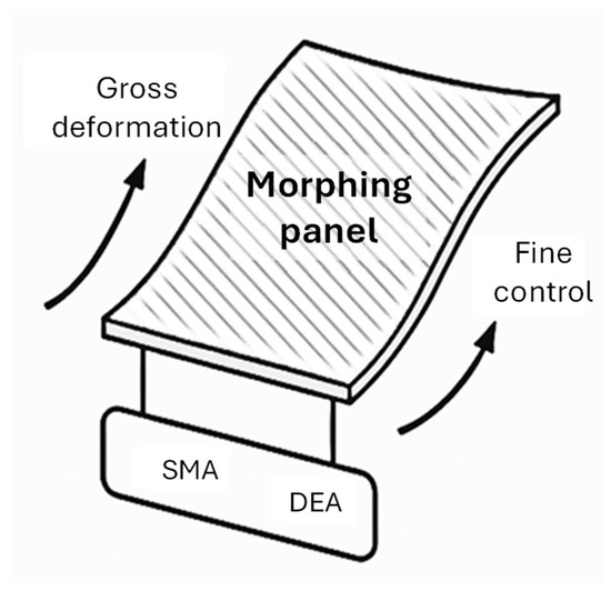 Hybrid actuator systems continue to gain momentum as a strategy for overcoming the limitations of individual actuator technologies. Combining materials with complementary mechanical and electromechanical properties allows for the design of actuators that can deliver both a high force and a fast response across a wide frequency spectrum. Cheng et al. [73] demonstrated this principle in the context of a smart SMA actuator for UAV tail wings, where the integration of thermally-driven SMA wires yielded the controlled morphing of aerodynamic surfaces—a paradigm that can readily extend to adaptive spoilers or cooling flaps in ground vehicles. Kashef Tabrizian et al. [74] proposed hybrid actuators that embed SMA wire helices into pneumatic rubber matrices, enabling multimodal deformation such as twisting, bending, and axial extension. These complex motions are especially relevant for bio-inspired surfaces that must adapt spatially to a shifting airflow or load conditions. A conceptual example of such integration, combining DEAs for fine control with SMA coils for gross deformation, is presented in Figure 5, illustrating how hybrid material strategies can enable real-time shape morphing across multiple scales.